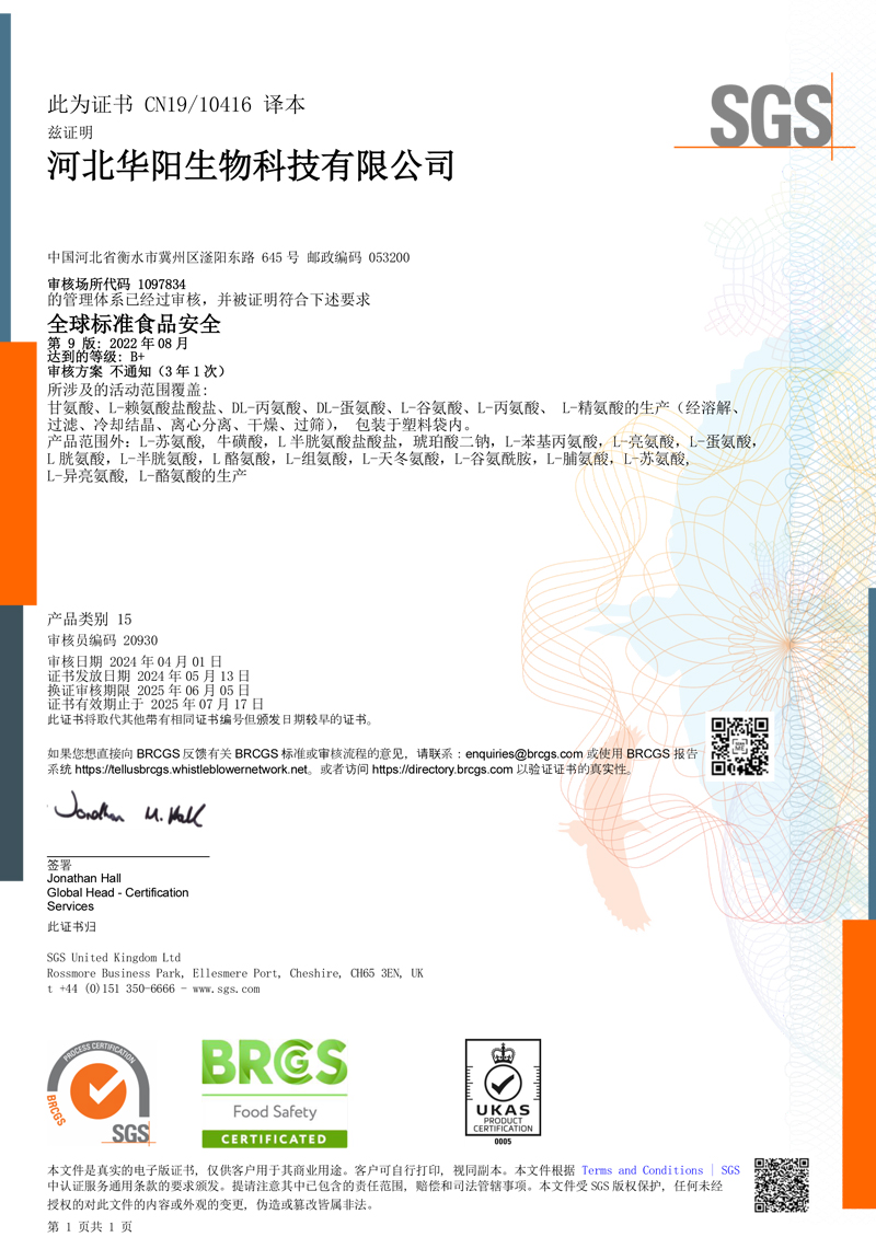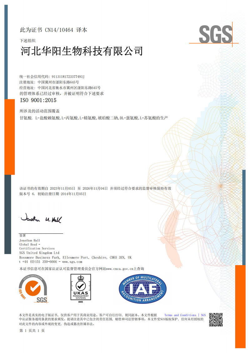 河北華陽(yáng)集團(tuán)坐落于河北省衡水市冀州區(qū)省級(jí)工業(yè)園區(qū)(始建于1987年,前身為冀州市華陽(yáng)化工有限責(zé)任公司)。集團(tuán)下屬四個(gè)公司:河北華陽(yáng)生物科技有限公司、河北華悅氨基酸科技有限公司、滄州華晨生物科技有限公司、衡水市陽(yáng)力商貿(mào)有限公司。主要生產(chǎn)甘氨酸、L-丙氨酸、L-蘇氨酸、DL-蛋氨酸、L-賴(lài)氨酸鹽酸鹽、L-半胱氨酸鹽酸鹽、干貝素等氨基酸系列食品級(jí)產(chǎn)品,廣泛應(yīng)用于食品、飲料、飼料等行業(yè)。......